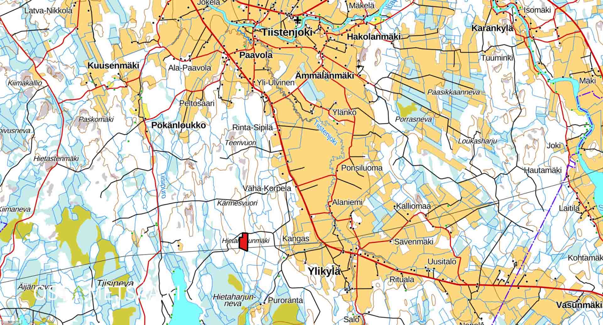 • Maastokartta, jossa myytävän kohteen rajaus punaisella Tiistenjoen Hietaharjunmäessä