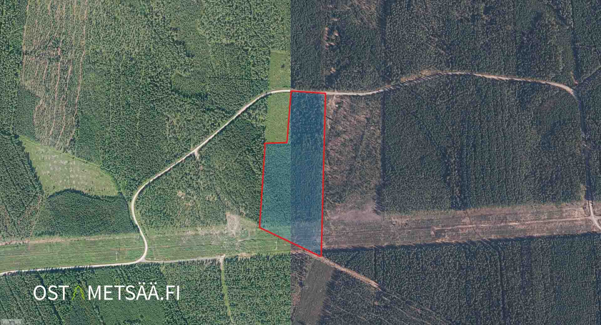 • Ilmakuva metsätilasta, rajaus punaisella – tilan rajoittuminen voimalinjaan ja tieyhteyteen nähtävissä