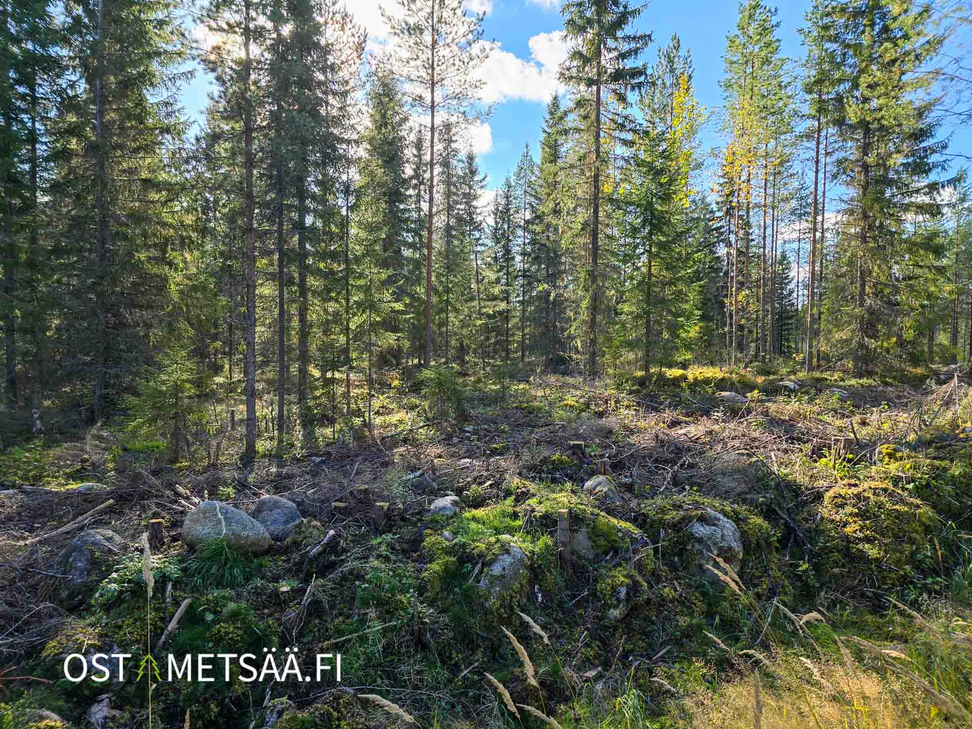 • Kivikkoinen kohta harvennettua metsää, näkyvissä kuusta ja mäntyä