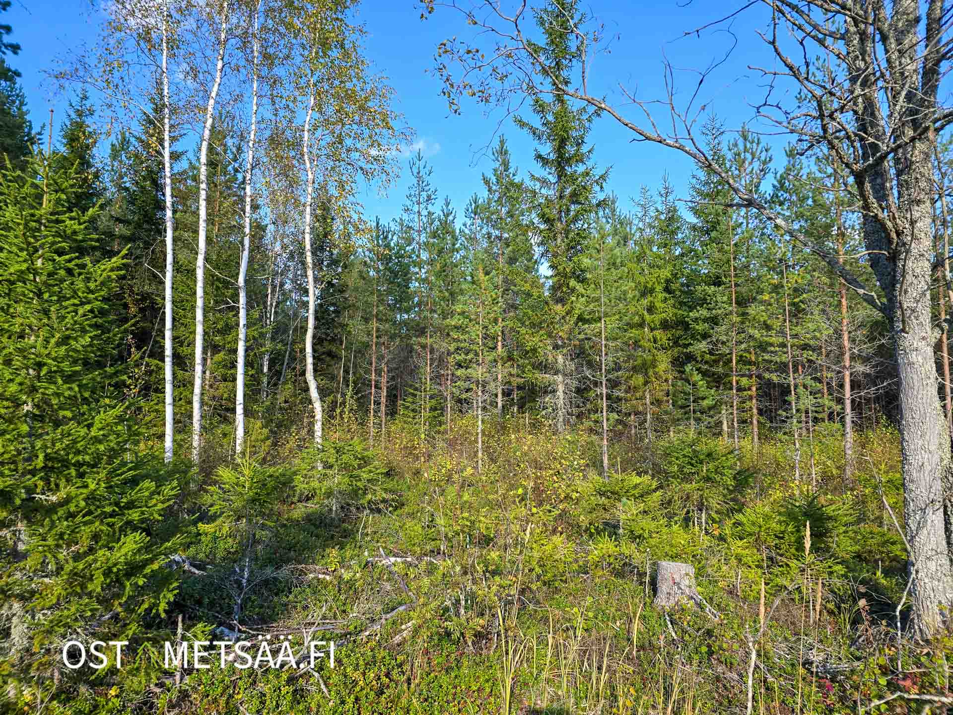 • Sekapuustoinen kasvatusmetsä, jossa näkyvissä harvennuksen jälkiä